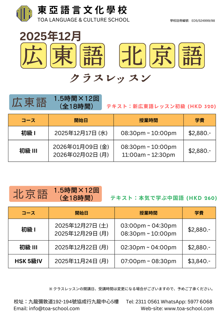 広東語・北京語 12月生募集中 ★東亞語言文化學校★
